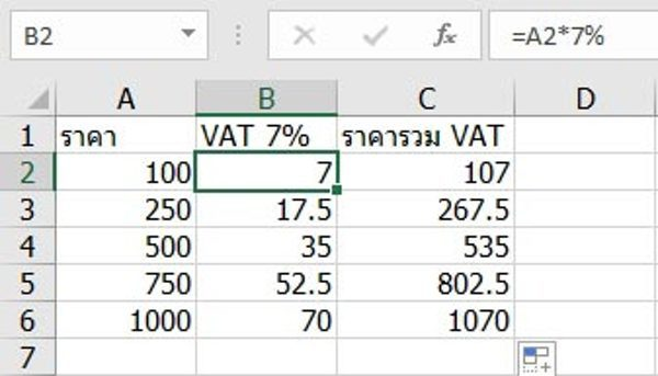 - ในเซลล์ B2: =A2*7% เพื่อหา VAT 7%